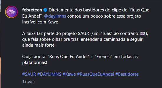 Em “Ruas Que Eu Andei”, a artista reflete sobre memórias e identidades formadas ao longo da vida, enquanto Kawe traz sua visão sobre a rua como espaço de luta e fé. Já “Frenesi” fala sobre viver no limite, com intensidade e entrega: “Eu vivo de frenesi, cê não entende”, canta a artista.